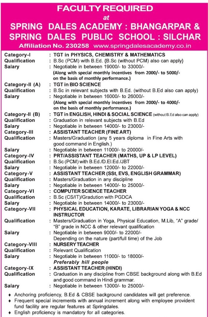 This is a chance for teachers. Spring Dales Academy is hiring teachers for subjects like Physics, Math, Bio-Science and Arts. They pay salaries and give bonuses for good work. They also provide school transport from Silchar to Bhangarpar. This is a help for people from Silchar.
